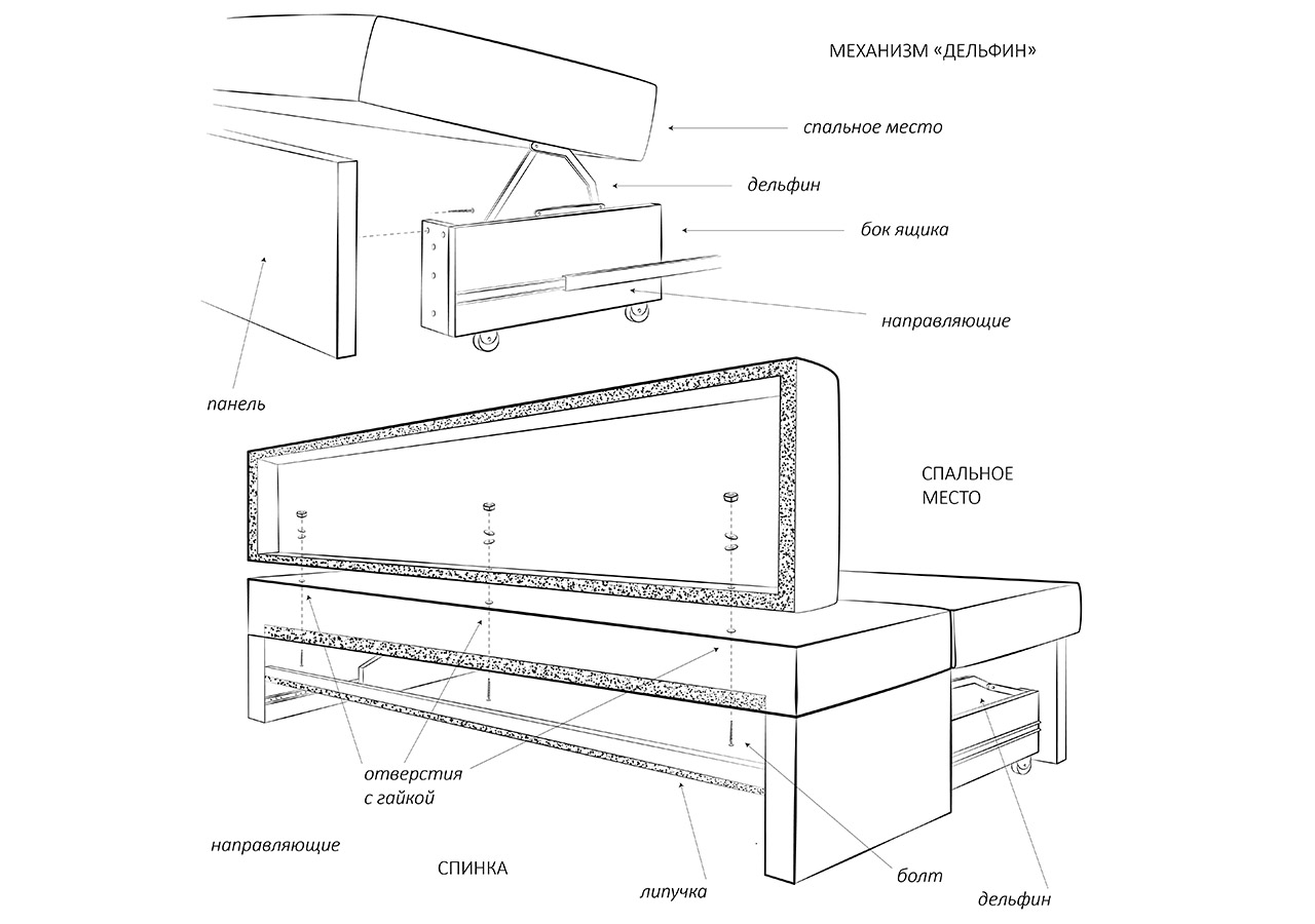- «дельфин» - название получено благодаря сходству раскладки с повадками этого морского млекопитающего, преимуществами данного типа являются способность выдерживать значительные весовые нагрузки, легкость эксплуатации. Под сиденьем дивана находятся две выдвижные секции, одна из которых «сложена» под вторую. При раскладывании обе половины выдвигаются, образуя большое спальное место;